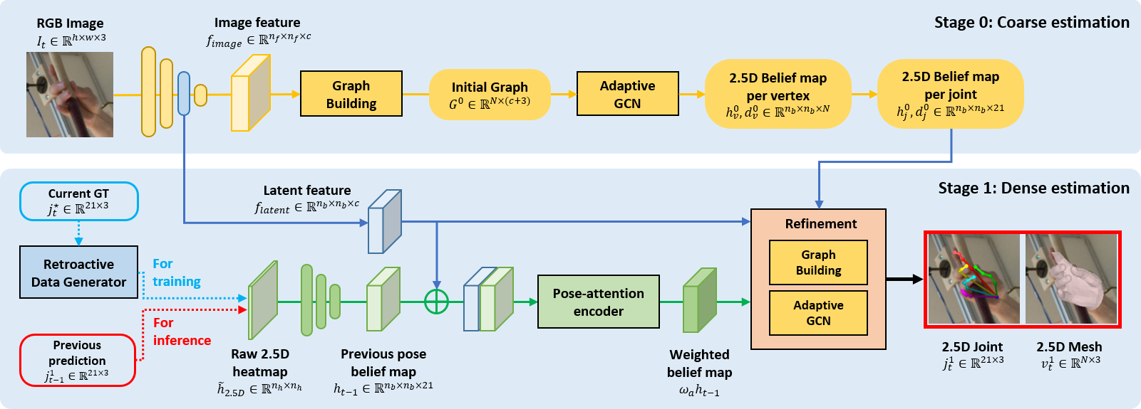 Our goal is to propose a hand tracking system in HMD by estimating a set of hand pose joints and mesh vertices, given an input RGB image and joint pose prediction from the previous frame. To fully utilize the given information, we designed a two-stage structured approach. In the first stage, we extract a feature map from the input image and estimate coarse pose through adaptive-GCN based module. In the second stage, we refine the prediction by using the regressed coarse pose and the adaptive temporal pose feature induced from the latent feature map in the intermediate stage and the information of the previous frame.