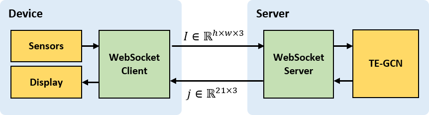 To overcome the challenge of deploying a deep learning network onto the HPU of the Hololens 2, we devised the offloading framework. The image data captured from the Hololens 2 is transmitted to a server and processed by our system to predict the hand pose, and only the predicted hand pose data is sent back to the Hololens 2.