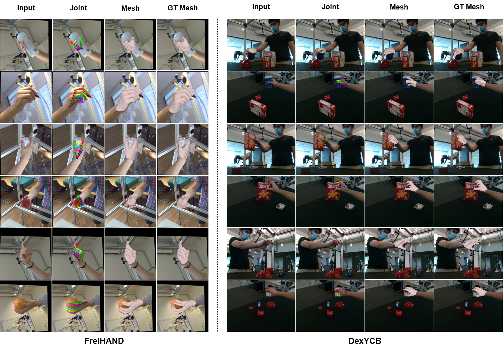 Quantitative results with the official test set of the FreiHAND dataset show close to state-of-the-art performance. Note that we perform the test assuming a zero value for all previous poses, as the FreiHAND is non-sequential. In other words, our method demonstrated notable accuracy even in the absence of temporal information, indicating its robustness in scenarios such as re-initialization due to tracking failure.
